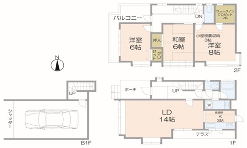| 間取り | LD14+K3+洋8・6帖・和6帖+グルニエ(屋根裏)3帖+車庫 |